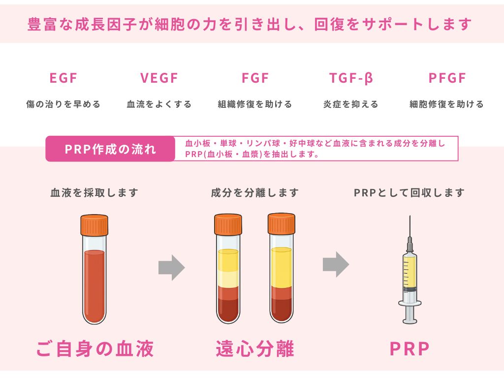 PRP(多⾎⼩板⾎漿:Platelet Rich Plasma)とは人が⽣まれながらに持っている「⾃然治癒⼒」を活かした治療法です。