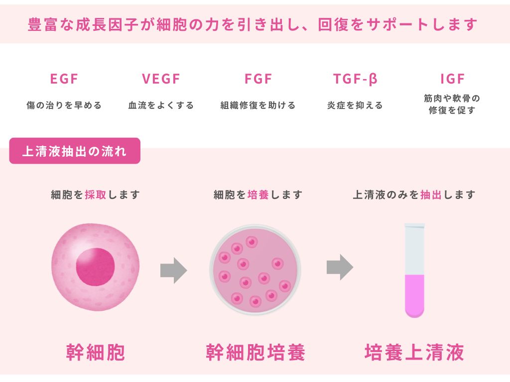 幹細胞培養上清液には、EGF・FGF・VEGFなどの成長因子やサイトカイン、エクソソームなどの生理活性物質が豊富に含まれています。これらは細胞の増殖や修復を促進し、関節・筋肉・靱帯などの組織回復や炎症抑制に寄与します。整形外科領域の再生医療を中心に、美容分野でも補助的に活用されています。